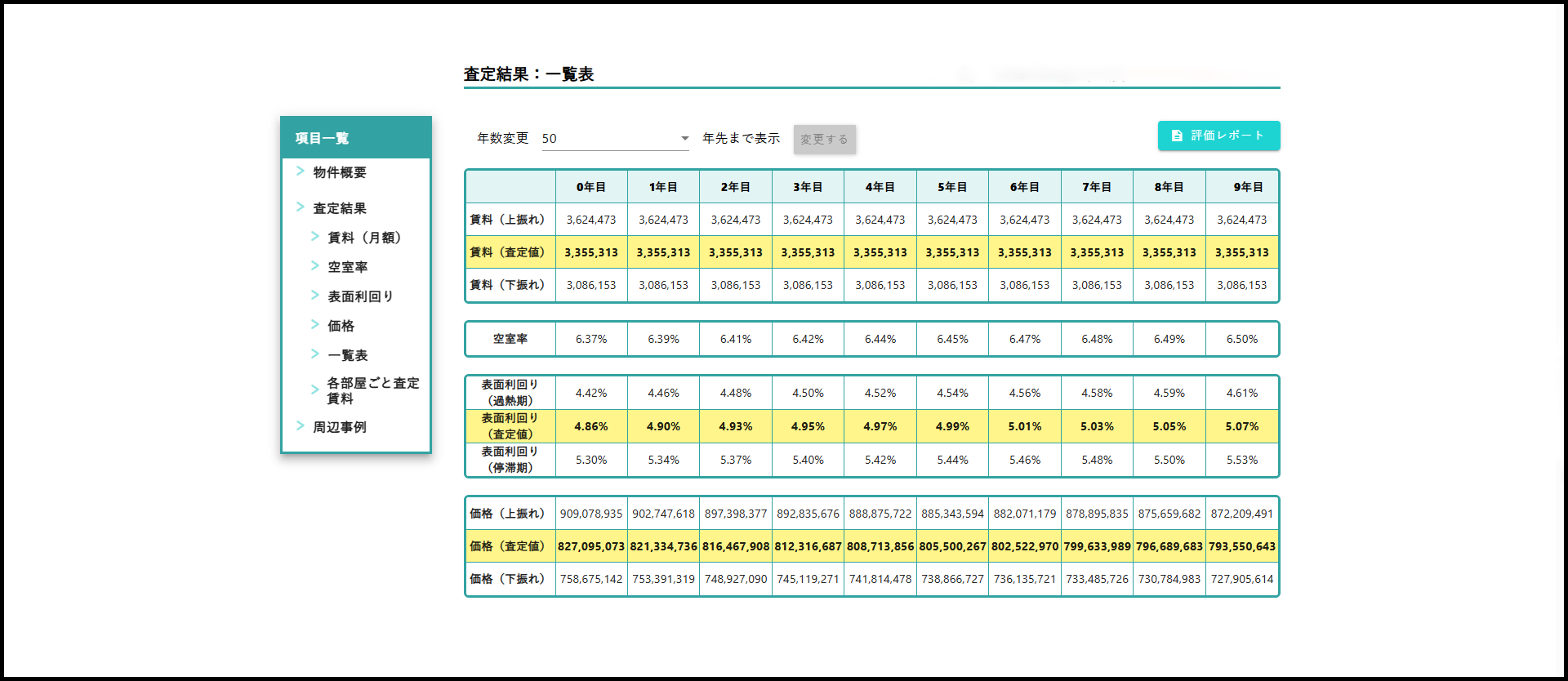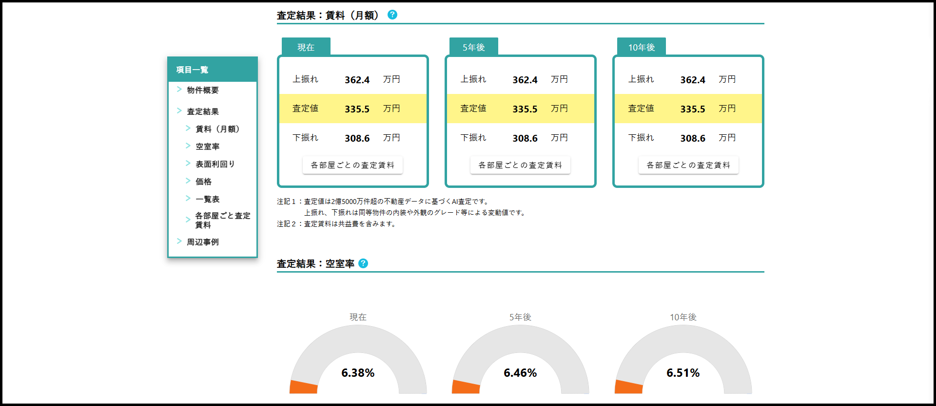 AI査定システムが、賃料、価格、空室率、利回りの将来予測を詳細に分析。