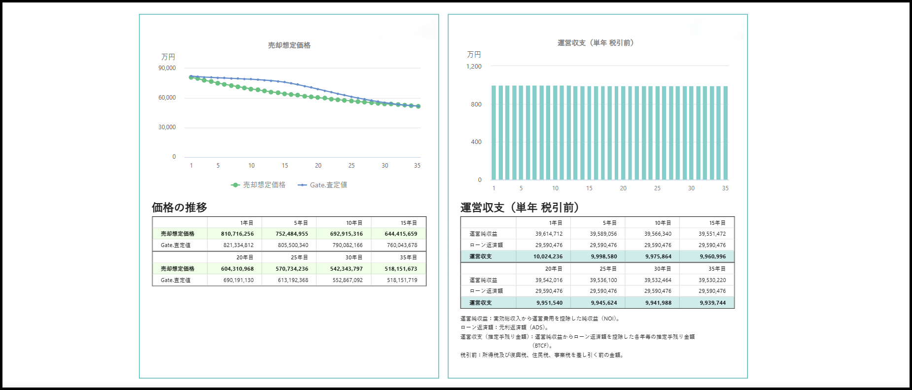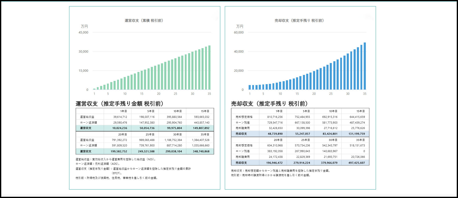 運営収支やキャッシュフローだけでなく、35 年先の売却想定価格のシミュレーションをAIが的確に算出します。